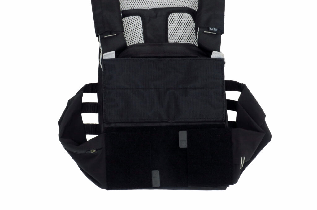 作りは通常のプレートキャリアと同様です。フロントのパネルを上げ、カマーバンドをベルクロで留めるオーソドックススタイルです。
