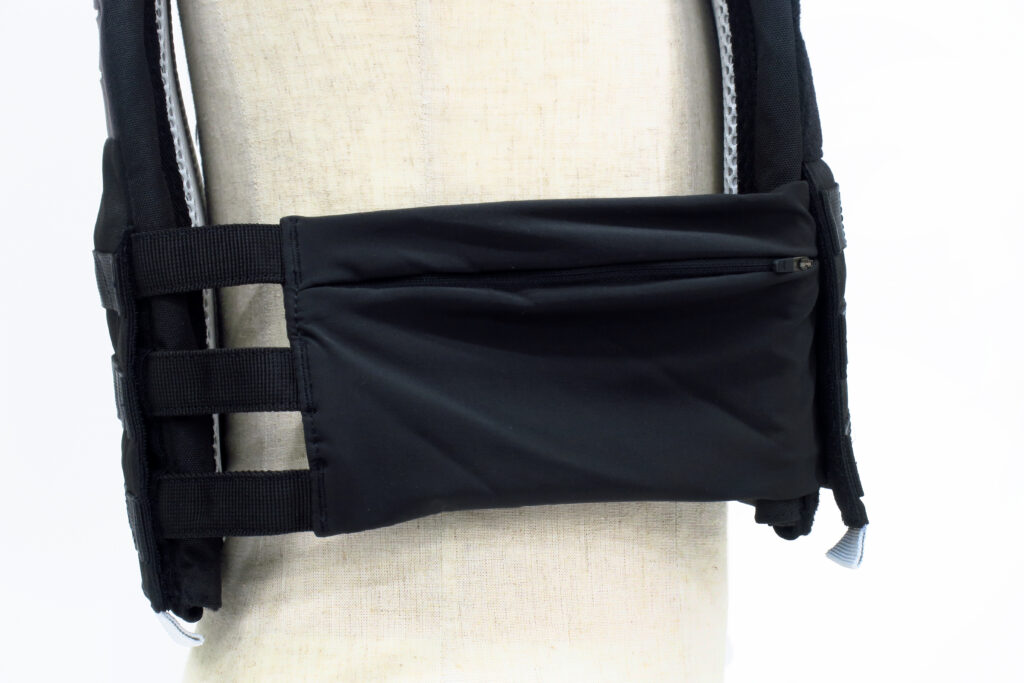 左側は伸縮素材の上下クロスオーバーの簡易ポケット。トレーニング時に財布など貴重品を入れておくのに最適です。